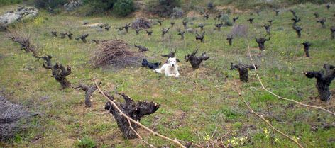 Las cepas tienen varios brazos. Los manuales de poda dicen que en cada brazo ha de quedar uno o dos sarmientos bien podados: a dos yemas (pulgares) si el sarmiento es débil; a más de dos yemas (varas), si el sarmiento es vigoroso. Pero cuando uno baja al campo y se ve cara a cara con esas cepas, que en el caso de LRO tienen -algunas de ellas- más de veinticinco o treinta años, nada es tan sencillo como dicen los manuales. Los seres vivos somos diversos. Viñas, perros, niños, flores. Podemos tener presentes algunas normas básicas, pero la verdad es que esas normas son pocas y no valen de nada si no se contextualizan…Las variables, además, no son siempre previsibles. Esto lo sabe cualquiera que tenga los ojos abiertos. Así que en la poda de los frutales, como en casi todo lo que tiene que ver con la «conducción» de seres vivos (conduire es el verbo que se usa en francés para las podas de formación), lo primero y más importante, en mi opinión, es el simple sentido común. Y la observación. Por ejemplo. Los manuales de poda dicen que los cortes han de ser limpios, sin dejar tocones. Pero el anterior propietario me explicó que si hacía eso el pámpano que brotaría después, con sus racimos colgando, se quebraría en la inserción: que había que dejar un toconcillo largo junto al pulgar escogido, para que el tal toconcillo sostuviera el peso de lo que crecería después en el pulgar…Y así es con todo. A veces hay que dejar más de dos sarmientos por brazo, a veces más de dos yemas por pulgar (porque la orientación de esas mismas yemas así lo exige), a veces hay que cortar con el serrote brazos enteros, a veces hay que preferir el sarmiento más débil, pero mejor colocado, en detrimento del más saludable, o a la inversa…