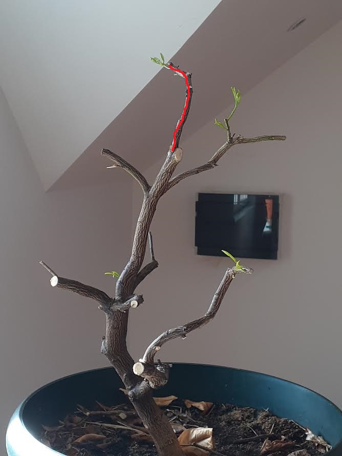 A finales de octubre empezaron a verse unos puntitos verdes en las ramas altas (por donde la savia sube derecha, sin codos, sin desviaciones). Asomaron por fin unos brotes, milimétricos pero de buen color, sanos. Aún hubo que podarlo un poco más. Y anteayer, cuando se volvió a quedar solo – lejos de las manazas del tal Yeison- tenía ya brotes de casi un palmo.