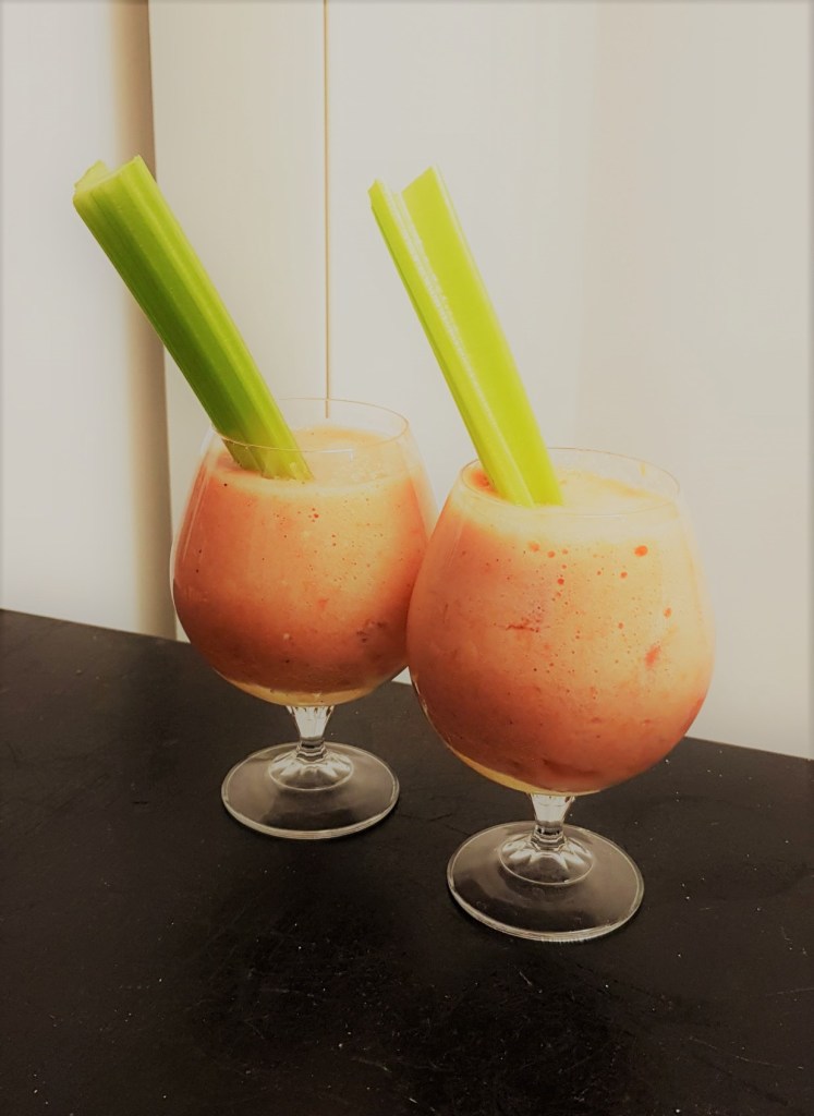 A pesar de lo dicho en el párrafo anterior, un Bloody Mary no es un gazpacho con vodka. Es un zumo de tomate, cuanto más dulce mejor (así no habrá que añadirle azúcar) mezclado con el zumo de 2 limones, un chorrito de salsa Worcester -ese brebaje británico, inclasificable- unas gotas de Tabasco -ese brebaje mejicano- y, para terminar, un generoso chorro de vodka (aprox. la mitad que de zumo), más sal y pimienta a gusto, como si fuera un bistec. La copa/vaso alto se completa con unos hielos y se adorna con una rama de apio (que también se come). Con el vodka, como con los tomates: que sea medianamente bueno, no aguarrás, aunque para preparar un combinado -en mi opinión- tampoco necesitamos un premium, de esos de 30-40 euros la botella «barata» de 70 cl. Al fin y al cabo, el vodka es solo aguïta (traducción literal del ruso, según leo en la wiki): un agüita de manantial + alcoholito puro, incoloro e inodoro, procedente de destilar cualquier grano, y hasta patatas valen para el caso (vodka gallego, por ejemplo, en la estela de los vodkas polacos (1)).