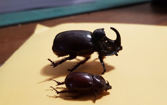 Dos machos: el grande es Oryctes nasicornis y el pequeño, de color castaño, Phyllognathus excavatus . Son de la misma familia (escarabeidos), y los dos tienen cuerno (grande o pequeño) en forma de media luna (cuarto creciente). Los dos aparecieron muertos estos días, uno en el campo y otro dentro de la furgoneta. He leído que los adultos de escarabajo-rinoceronte apenas se alimentan. Viven unos pocos meses, lo justo para procrear. Revolotean como drones al atardecer, cerca de los puntos de luz, quizá también -pienso ahora- cerca de los faros de los coches (?). Las larvas son otro cantar: gordas como langostinos pelados, el doble o el triple de grandes que las del escarabajo sanjuanero, viven durante años entre los restos de hojas secas, serrín y leña fina; por ejemplo, la que «sobró» después de cortar las ramas que rompió la nevada en enero. Muchos montones quedaron por ahí apilados. En parte porque los forestales ya no expedían más permisos de quema; en parte porque está bien que sea así… Las larvas de los escarabajos rinoceronte se alimentan de esa madera en descomposición. Aceleran el proceso. Ayudan. No son los únicos escarabajos que lo hacen, pero sí los más espectaculares (ciervos volantes no he visto aún, no aquí).