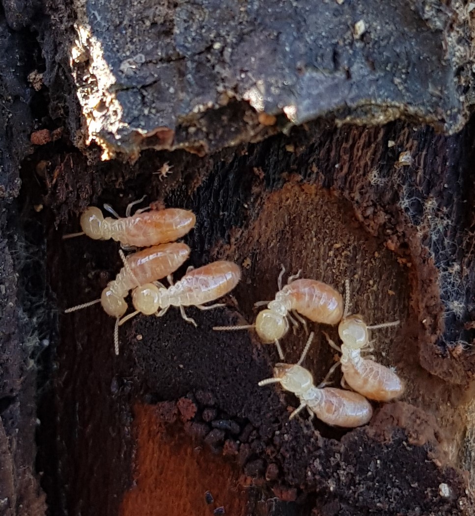 Añado esta otra foto de las termitas de LRO; hinchadas y lustrosas Kalotermes flavicollis , “hermosas termitas de cuello amarillo”. El nido es pequeño; lo hacen entre la madera, que, como se ve en la foto, está también llena de excrementos y tierra. Cuando alguna termita «echa alas» y se va a iniciar otra colonia, se la puede ver en los montones de leña que quedaron sin quemar en primavera. Entre esa leña hay ramas secas de almendros y ciruelos (foto de arriba). La termita en fase alada es la única que va con «collar», esa bufanda amarilla que da nombre a su especie (flavicollis; pero sólo tengo fotos de la tropa de obreras sin alas, en invierno). Todas son ciegas. He aprendido en pasiontermitas.com que lo que les espanta no es la luz sino el aire, el peligro de la deshidratación.