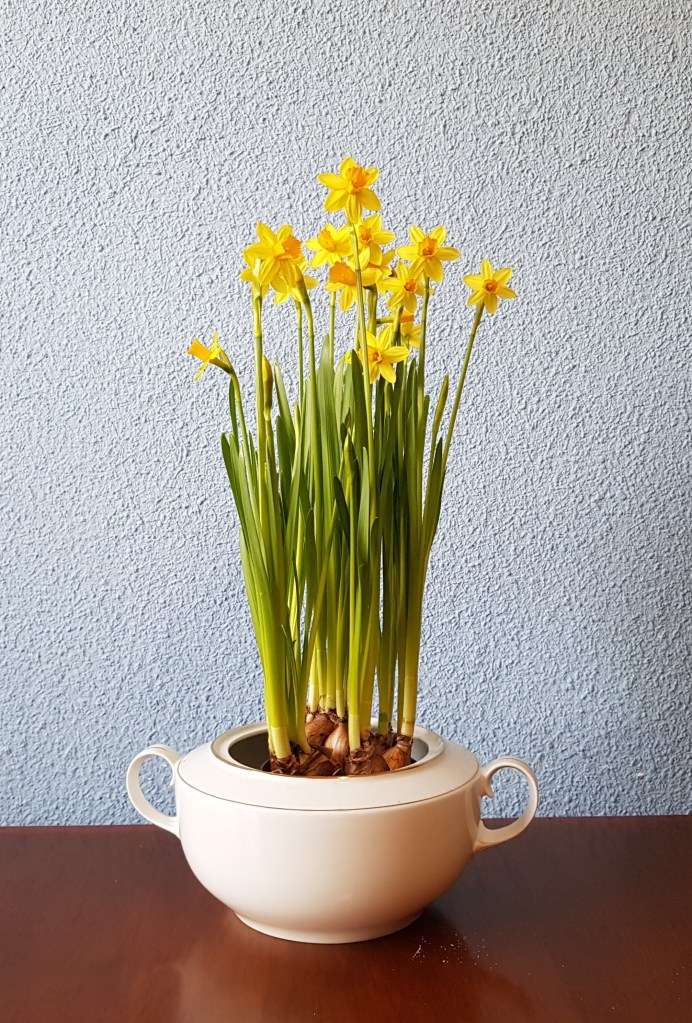 Es posible que detrás de esta maceta haya algún animal. En plan un conejo, o unas gallinas. No digo literalmente detrás, triturando los cables de la máquina de coca cola… sino en algún lugar no muy alejado del bar -digamos en el patio- para que el dueño pueda llevarles unas hojas de col de vez en cuando. Por eso está tan alta la primera col (las hojas que faltan pueden haberse reciclado ya en huevos fritos). En cuanto a la segunda, parece una col rizada, de las que no «suben». Pero es un acierto no haber puesto dos coles idénticas: ninguna destacaría. La maceta es más alegre y bien proporcionada así. Dos tallos refaldados dejarían demasiada pared a la vista. Además, las hojas de la col rizada parecen de papel froissé -llaman la atención por eso-, y su tono verde manzana casa bien con lo que queda de las gitanillas.