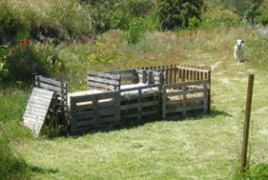 2- Mantener una temperatura elevada en el centro del montón, para que las bacterias trabajen a buen ritmo, sobre todo en la primera fase del proceso. Por eso es bueno “encerrar” la materia orgánica (con unos palés, por ejemplo): así la altura del montón sube, no se desparrama todo por los lados, y se hace más presión en el centro. En invierno la descomposición se ralentiza. Aquí hemos puesto composteros un poco por todas partes (para no tener que andar trasegando la hierba y demás), pero en las zonas donde hiela durante semanas tapamos el montón con sacos o con malla permeable. Pasada la primera fase –de descomposición rápida– la temperatura baja de forma natural. Al voltear entonces el compostero, materiales verdes que habían quedado en la periferia pasan al centro, y así vuelve a recalentarse un poco el montón. Si en la finca hubiera gallinas (en esta no), garantizo que irán a dormir a lo alto del compostero, encaramadas al palet y con el culo hacia dentro, para aprovechar el calorcillo.