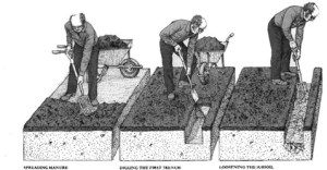 1. La primera forma de preparar la tierra implica dejarse la espalda cavando. Instrucciones para preparar un bancal profundo estándar, en palabras de su gran divulgador, el británico John Seymour: (1) se estercola bien la superficie, (2) se cava una primera hilada (de unos 30 cm de ancho) hasta la profundidad de una pala, y se separa esa tierra; (3)se mulle la tierra en la profundidad otra pala utilizando un bieldo/horca(* es decir, hablamos de trabajar la tierra unos 60 cm). Y (4) se rellena esa hilera con la tierra de la siguiente hilera. Una vez terminado el proceso no se puede volver a pisar encima del bancal. “El suelo tan suelto permite que las raíces penetren hacia abajo en lugar de extenderse hacia los lados (…). Las hortalizas serán más grandes y se las podrá cultivar más juntas…».