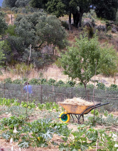 En el año 2010 pusimos finalmente la primera de las «huertas de la entrada». Para entonces el pastor estaba ya muy mal de la espalda (y las rodillas). En vez de venir hasta allí las ovejas, iba yo al «tinao» a recoger estiércol. También hemos hablado de esto en otros posts. Bueno. Gracias al «abono verde» de la avena y la alfalfa, a la recuperación de la cubierta vegetal y al fin de la erosión, todo ello acompañado de sacos de estiércol y bastante paciencia (mezclada con vagancia)… la tierra se recuperó. En el 2012 se puso una «segunda huerta de la entrada», para ir alternando los cultivos y tratar de engañar a algunos parásitos. Los pocos metros cuadrados que pueden robar las raíces de los siete almendros supervivientes se compensan más que de sobra con lo agradecido de su sombra. Que se lo pregunten, si no, a los calabacines. Son dos huertas muy apañadas. En la segunda quincena de agosto la sombra del alcornoque se extiende a última hora de la tarde por la primera huerta. ¡Y cómo se lo agradecen las coles!. Pensando en esa sombra, contando con ella, plantamos precisamente ahí lo que más frescor necesita en esa época del año.