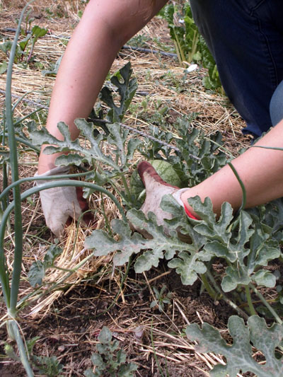 En algunos cultivos, además, esos cojines de paja cumplen alguna otra función añadida. Sobre ellos se recuestan mis preciosas sandías “Crimson”, como en una chaisse longue diseñada a medida, y ahí van engordando lánguidamente –sin magullarse ni ensuciarse- hasta que llega el día de hincarles el diente. En capas de hasta cuarenta centímetros de paja coloco los tomates morunos, que de lo contrario se revolcarían, o se romperían, por muchas cuerdas y tutores que pongamos por todas partes (no son tomates de enrame); la alternativa es usar cajas de madera, las que dejan los fruteros en la puerta de la tienda, pero el inconveniente de las cajas, en mi opinión, es que dificultan el riego (el manejo de la manguera), además de lo evidente: que no aportan nada ni a la química ni a la física del suelo, como sí hacen los acolchados orgánicos a medio y largo plazo.