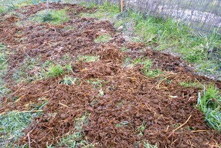 Abono orgánico. (Foto: estiércol de caballo cubriendo lo que queda de la huerta en invierno; lo suyo sería taparlo bien con una buena manta de hojas secas). El abono orgánico, el que compramos como tal, en realidad está formado casi exclusivamente (“casi”, según lo que nos vendan en cada caso…) de restos orgánicos animales. Estiércoles deshidratados. Muy ricos químicamente –no sólo en los tres “macronutrientes” imprescindibles, N, P, K- pero no siempre estables en el suelo o no siempre disponibles para las raíces (la capacidad de asimilar ese alimento depende del estado del suelo y de la planta; si éste es malo, el abono no hace nada; sería como ofrecerle una mariscada a un enfermo terminal). Por otra parte, los abonos fuertemente nitrogenados -y los orgánicos, con matices según el origen, lo son- duran un telediario (en realidad, la estabilidad del N depende de su forma de presentación: amoniacal, nítrica…pero como principio general creo que vale). En conclusión: un abono mejora la alimentación de la planta (siempre y cuando todo vaya bien), pero una “enmienda” –mantillo, humus- mejora las condiciones del suelo (y a la larga, lo hemos visto, también la alimentación). El abono es “química” y para ya; la enmienda es “física y química”, y para un buen rato.