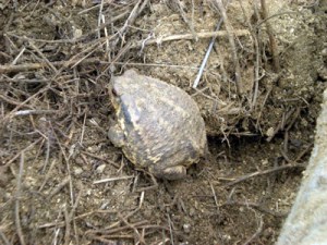 En el compostero que hay junto a la charca me encontré el año pasado con este hermoso sapo (sapo común, Bufo bufo). Fue más o menos por estas fechas. Estaba vaciando el compostero para llevarme todo el contenido hasta la huerta de abajo. El sapo entró sin querer en mi carretilla, escondido entre la tierra y las hierbas. Se infló como un globo para avisarme de que estaba ahí –cosa que le agradecí mucho– y acto seguido dió un saltito desde el borde de la carretilla y se volvió a la charca. Teniendo en cuenta el tamaño, es muy probable que se tratara de una hembra.