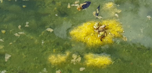 Ranas del Mundo Flotante . El jardín de la alberca: una vieja plancha de poliespán donde juegan al veo-veo las ranas y la culebrilla de agua (Natrix maura, buena nadadora). De la plancha saltan al agua y del agua a esos espumarajos amarillos, algas -pelotas de algas- que me taponan a cada poco la manguera de riego.