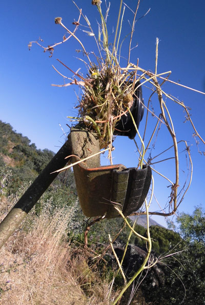 Cuando limpiamos de grama las huertas, operación agotadora donde las haya, capachos enteros de rizomas y tierra se van a continuación al camino. Después procuramos pisotear el mejunje pasándole con la furgo por encima, para que la grieta quede bien bien tapada. Vaciamos también -mezclado con lo demás- los haces de sarmientos (picados con la tijera de dos manos) que hayan podido quedar olvidados por la viña, e incluso los calderos con ceniza de la chimenea. En alguna ocasión hemos llevado escombro: pero cuidado, ha de ser escombro seleccionado, menudo, que colmate bien el fondo de la grieta al tiempo que deja correr el agua . Hay que ir vaciando saquito a saquito y cubrirlo todo cuidadosamente con tierra (llevar azada en el maletero). Los trozos grandes de cemento, ladrillos, yeso, etc, además de horrendos son peligrosos (si una moto de cross o un «quad» -verdaderas plagas del campo- los pinza y te los deja para arriba…adios neumático)