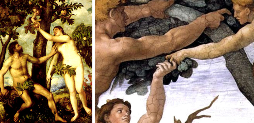 Para solucionar este dilema lo suyo es consultar el Génesis, capítulo tres. Y ahí está la sorpresa, que en el Génesis no se dice nada, ni una palabra, sobre cuál era el «fruto prohibido», pero sí se dice explícitamente que se taparon con… ¡hojas de higuera! (estupendas, por su buen tamaño, para tapar lo que se quiera). Así pues, ¿de dónde hemos sacado nosotros eso de la manzana de Eva y eso de que se taparon con hojas de parra?. No de la Biblia, desde luego. Lo hemos sacado de las imágenes, no de los textos. De las imágenes que desde el Renacimiento en adelante nos han ido acostumbrando a una determinada iconografía (y el hecho de que no estuviera sustentada en las Escrituras era lo de menos, porque tampoco las contrariaba en lo sustancial: fuera una manzana fuera un kiwi, lo grave era habérselo comido).