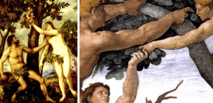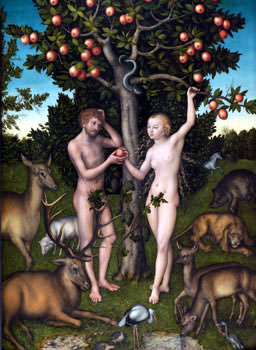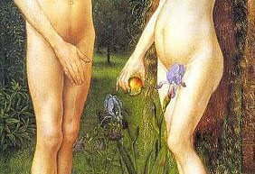 - Los dos se tapan con hojas de parra pero el fruto es una manzana. Incoherente y sin relación con el Génesis. Es el cuadro de H. Memling, alguno de los de Cranach, el grabado de Durero, etc.