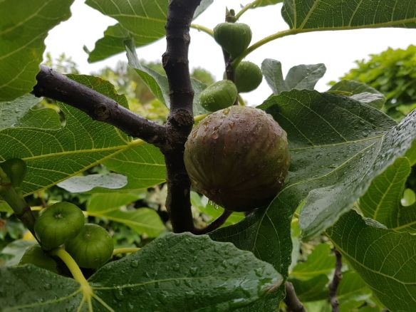 Brevas negras, rojas por dentro, de la higuera napolitana plantada en el jardín. El árbol crece despacio (no importa cuánto se le riegue), pero es generoso desde los primeros años: muchos higos ya, que madurarán en agosto, y algunas brevas para la merienda (hoy, 24 de junio).