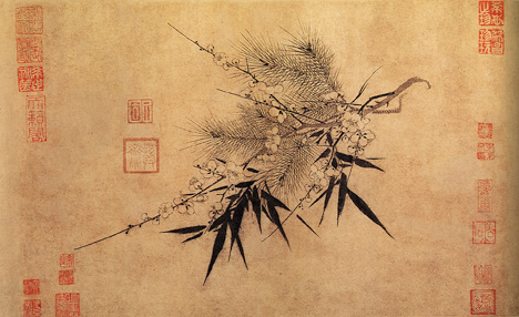 El pino (song) y el bambú (zhú) atraviesan el frío y la noche invernal sin apenas inmutarse (algunas ramas partidas, la punta de las hojas helada). El tercer amigo, el albaricoquero (méi) , se suma ahora a sus dos compañeros. Lo hace en un momento muy preciso del año, a la salida del invierno, cuando marzo quiere ser abril pero todavía parece febrero: las yemas están hinchadas, ya se ve el color de los pétalos, y sólo falta que la temperatura suba un poco para que las flores se decidan a abrirse del todo.