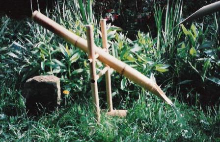 NOTAS (1) No se puede evitar. Seguro que a algunos japoneses del siglo XXI les encantaría encontrar un jardín morisco, o un olivar… en las faldas del Fujiyama. (2) «El Camino del Samurai». (3) Quizá no haya que renunciar a nada. Lo complicado es tomar de cada estilo de jardín aquello que SÍ puede adaptarse a nuestro mundo (nuestros vegetales,/ clima/ entorno cultural). Por ejemplo: podar nuestras santolinas y las lavandas en formas más o menos esféricas pero asimétricas. Este mínimo detalle es típicamente japonés -ajeno al jardín occidental- pero suele quedar muy bien…Como el uso en grandes masas de los iris ( usando, en lugar de las especies japonesas, los híbridos de jardín, rizomatosos, que soportan bien la sequía), etc. Lo que no funciona, me parece, es la imitación literal. En cuanto al shishi-odosi, resulta tan extraño en un jardín de Madrid como, no sé, ¿un botafumeiro?