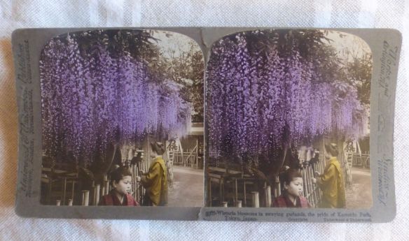 Sobre el Viaje a Kameydo. Quizá los Viajes con mayúscula, tal como aparecían descritos en esta publicity de 1910, hoy tienen que ser a la fuerza»mentales», y no el producto de una elección -quedarse en el sofá, aprender mucho sin gastar un dolar… así sigue el anuncio transcrito de U&U-, pues ya solo pueden darse en el tiempo, y solo hacia atrás. Pero si uno todavía cree posible lo otro, y además quiere, y además puede levantarse de ese sofá y costearse un viaje por el espacio aunque sea en mínúscula… el momento para sacar el billete es ya, porque en menos de un mes estarán en flor las glicinias/Wisterias. El link para el próximo Festival de la Glicinia de Kameydo: https://www.japanistry.com/event/kameidoten-shrine-wisteria-festival/ Kameydo -leo en la guías virtuales de Tokyo- es un barrio del centro de la ciudad, en el que se encuentra el santuario sintoísta del mismo nombre. De ahí son estas glicinias, Wisteria japonica, y no del «Kameydo Park» que aparece escrito en el borde del cartón de U & U.. Hoy en día, según leo por la red, «Kameydo Park» está totalmente separado del templo y de las glicinias (que sí, ahí siguen) por un aquelarre de rascacielos, vías de tren, metro, carreteras (?)