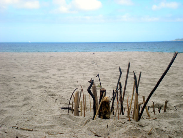 Instrucciones: plantar el jardín nada más llegar a la playa. Colocar la toalla detrás, para entrever el mar a través de los palitroques. El jardín -que es efímero y no pide nada- durará lo que tarde la marea en subir hasta él.