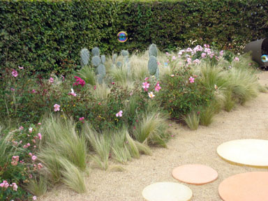 Y es que aquí no tenemos nada que pueda compararse a un festival como el de Chaumont. Tenemos festivales gastronómicos, musicales, y otro tipo de cosas estupendas. Pero de jardines, nada. Cuando uno salta desde la plataforma en la que trabajan los grandes paisajistas –los de «Casa y Jardín», para entendernos– va a darse de bruces directamente contra el suelo: el terreno de los jardineros de mantenimiento, que son albañiles o agricultores reciclados en el mejor de los casos, y en el peor (que es lo habitual), jóvenes españoles sin cualificación, que sienten el mismo interés por podar un rosal que por conducir una carretilla elevadora; estos jardineros que pululan por las comunidades de vecinos y urbanizaciones de las afueras se reparten el business con los emigrantes sudamericanos, marroquíes y rumanos, quienes, como ellos mismos, trabajan por cuatro perras (qué remedio) y han aprendido a marchas forzadas en las grandes compañías de mantenimiento, las que se llevan las contratas de los ayuntamientos (desbrozar cunetas, limpiar aparcamientos, etc). Pueden ser buenos trabajadores, pueden tener pericia en el manejo de las máquinas, pero ni saben una palabra de botánica o agronomía, ni consideran que sea necesario saberla para cuidar un jardín. Naturalmente, los propietarios del jardín no son exigentes. En España no lo son, ni siquiera cuando creen serlo… Y lo que están dispuestos a pagar a estos jardineros improvisados es lo mínimo (ocho euros/hora, cinco si es en negro). Una familia de nivel económico medio dedicará el 95% de su presupuesto a la casa y al coche, pero ¿al jardín?. Con que esté limpio basta. Seto de “arizónicas”, + extensión de césped + puñado de rosales sin padre ni madre en la entrada. Este tipo de propietario estándar –el de los miles de chalés/segundas residencias surgidos como hongos al calor de la burbuja inmobiliaria, o el coprietario distraído de una comunidad de vecinos– tampoco considera la posibilidad de que haya otra forma de hacer las cosas. Y si sale a otros países de vacaciones, no ve lo que no llama su atención, aunque lo tenga delante de los ojos (foto 2: Chaumont, soluciones para suelos muy secos; más abajo, foto 3: chumberas, rosas y gramíneas). O puede que sí lo vean y puede que sí se admiren, pero eso no significa que vayan a hacer comparaciones constructivas y a extraer de ellas la menor conclusión práctica. ¿Por qué somos así?. No lo sé. El ciudadano español medio tampoco le pide mucho a su ayuntamiento en cuestión de espacios verdes públicos. Pide, de hecho, lo mismo que para su pequeño jardín (el que lo tiene). Y ni él, ni su jardinero, ni el representante de la administración necesitan festivales de jardinería ni nada por el estilo. En todo caso, si se hace una “feria del jardín” a lo grande, como acostumbramos a hacerlo todo por aquí, lo que encontraremos en ella es lo último en maquinaria, nuevos cachivaches, pérgolas y casitas de jardín, barbacoas, horripilantes cabezas de Buda, tumbonas de maderas imputrescibles (procedentes de selvas tropicales en peligro de extinción), etc, etc. Supongo que la falta de empatía con la naturaleza (¡la de verdad, no la de adorno!) es un defecto cultural que arrastramos desde la noche de los tiempos pero ¿por qué nos hemos curado en tantas otras cosas y en esta seguimos así?.