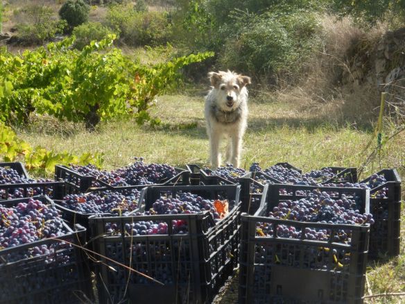 El Joaquín -me dice Miguel- ha recogido ya el albillo pero aún no ha empezado con la garnacha. Mal hecho, mal hecho. Y suelta unas risitas zorrunas, y asiente con la cabeza, dándose la razón a sí mismo, porque – aun estando como está, con la espalda doblada, dos prótesis de rodilla etc- Miguel sigue siendo, además de listo y observador (como todos los cabreros), un poco/bastante cotilla. Ha llovido fuerte durante tres días, continúa (en el pluviómetro de la cocina: 57 litros), y ahora, por confiado, recogerá solo uvas aguadas, ¡el Joaquín! O a lo mejor no -replico, solidarizándome con el otro-. Ya escurrirán. Volverá el calor. Yo misma he dejado dos «líneos» de uvas sin recoger. Poca cosa, pero de mucha sustancia. Tendrán más grado. Haré con ellas una barriquita «premium», para paladares finos como el de Severo… (vuelta a reírse el cabrero)
