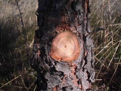 La herida de esta conífera no se cerrará con ese callo perfecto y limpio (esa rosquilla de savia y cosas buenas) que cierra enseguida las heridas de las especies frondosas… pero eso no significa que la madera vaya a pudrirse. No hay cuidado. El árbol produce resinas, aceites, ceras, gomas variadas y tóxicas (para los insectos y hongos xilófagos) que untarán, pringarán y taponarán cualquier ventanuco que quede abierto. Será como pasar una bayeta con detergente por todas las habitaciones. Por eso la madera de conífera resiste mejor las pudriciones, aunque la herida tarde en cerrarse. Por eso -dicen los libros- eran de cedro los barcos fenicios, o de sabina los galeones que Felipe II mandó tontamente a la Pérfida Albión…y que ahí siguen, en el fondo del océano, cuatro siglos después de naufragadas.