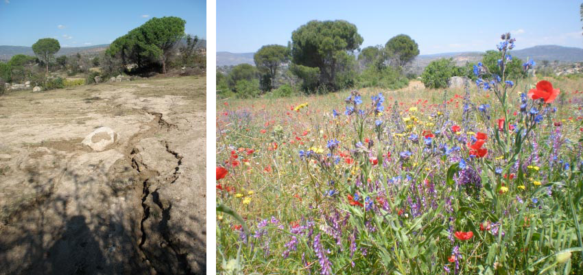 En tres años la finca se ha llenado de saltamontes, mariposas, escarabajos. Y claro: también de abejarucos, de tórtolas, de alcaudones, de sapos y todo tipo de reptiles… Hacia mediados de junio el campo empieza a agostarse. Muchos invertebrados terminan por entonces su ciclo reproductivo, y es en ese preciso momento cuando hay que empezar a desbrozar. Sin descanso. En un mes no deberían quedar más que islotes marginales, pequeños refugios dispersos aquí y allá.