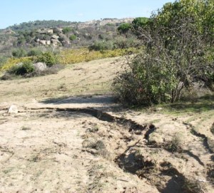 - En otoño y en invierno el problema puede ser el exceso de arado. Una vez podría bastar, creo yo, “para que la tierra se cargue bien de agua”. Pero todos los años veo que muchos aran dos y hasta tres veces entre la vendimia, en octubre, y la poda, a finales de febrero. Con la tierra removida y pocas o ninguna raíces para sostenerla, la lluvia abre grietas profundas allí donde la pendiente es un poco pronunciada. Las grietas se convierten en cárcavas. Y en algunos rincones, con el paso de los años, esas cárcavas acaban dejando ver el hueso: la roca madre que aflora. Así que el cuarto argumento tampoco me convence, al menos no completamente.